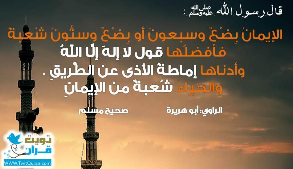 الإ يم ان ب ض ع و س ب ع ون ش ع ب ة أ ف ض ل ه ا ق و ل لا إ ل ه إ لا الل ه و أ د ن اه ا إ م اط ة الأ ذ ى ع ن الط ر يق