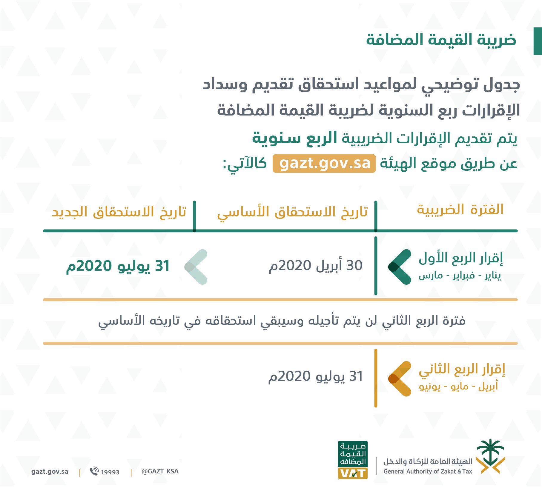 الهيئة العامة للزكاة والدخل No Twitter تعر ف على الجدول الزمني لتقديم الإقرارات الضريبية لضريبة القيمة المضافة بعد تنفيذ خطة تحفيز الاقتصاد ودعم القطاع الخاص Https T Co 5xesc0vheu