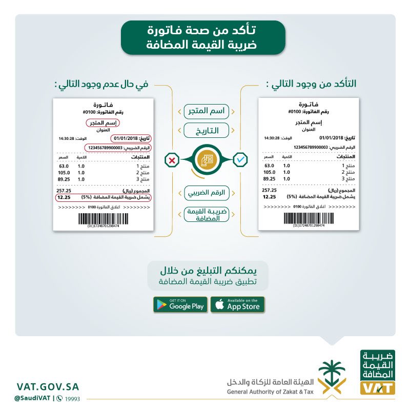 الهيئة العامة للزكاة والدخل No Twitter تعر ف على أهم العناصر في الفاتورة الضريبية والتي تمكنك عند شرائك من التأكد من صحة فاتورة ضريبة القيمة المضافة ويمكن الإبلاغ عن المخالفات من خلال التطبيق الالكتروني